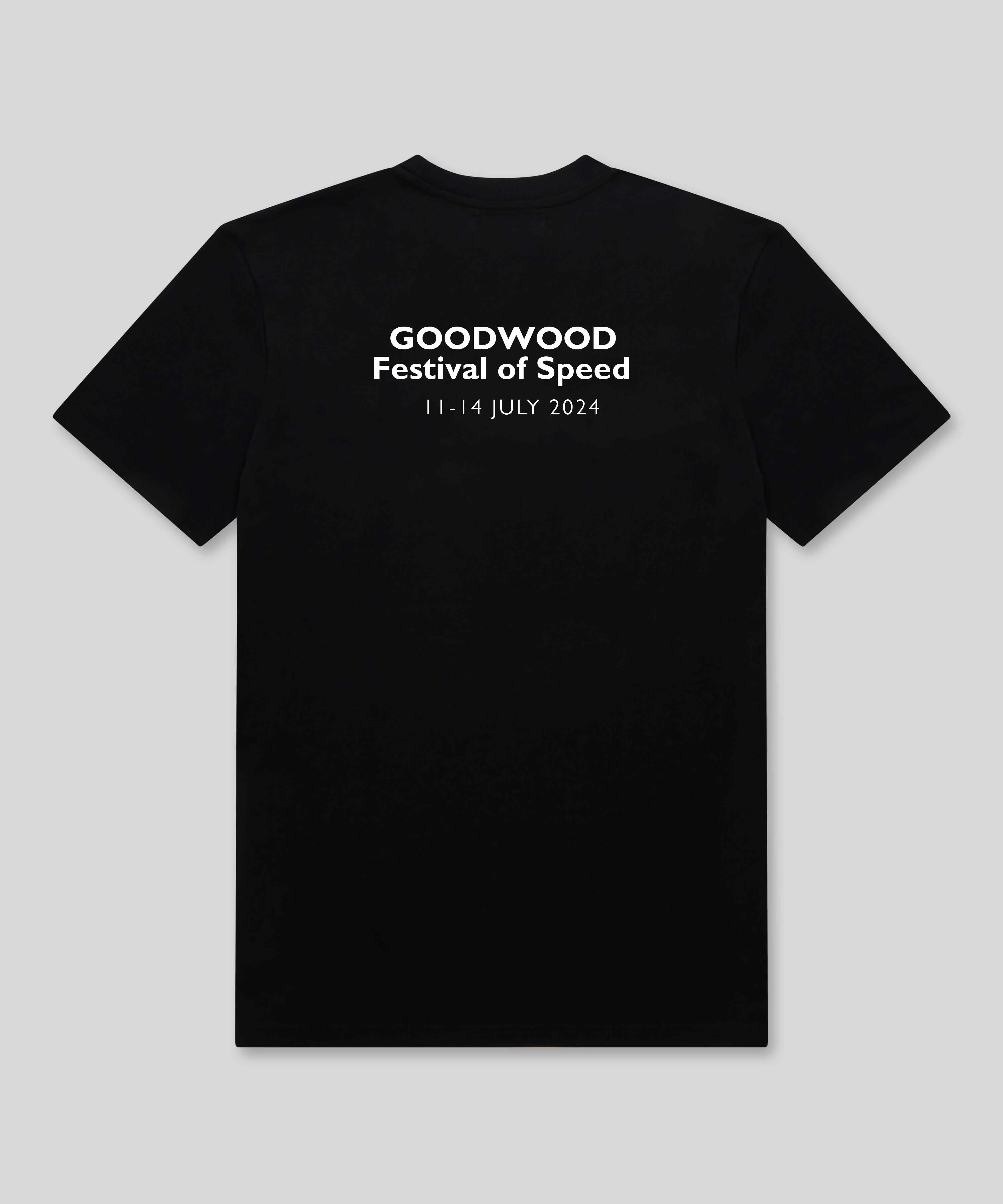 Featuring Jackie Oliver driving his Can-Am championship winning Shadow car, this celebration poster t-shirt is a must have to celebrate FOS 2024.